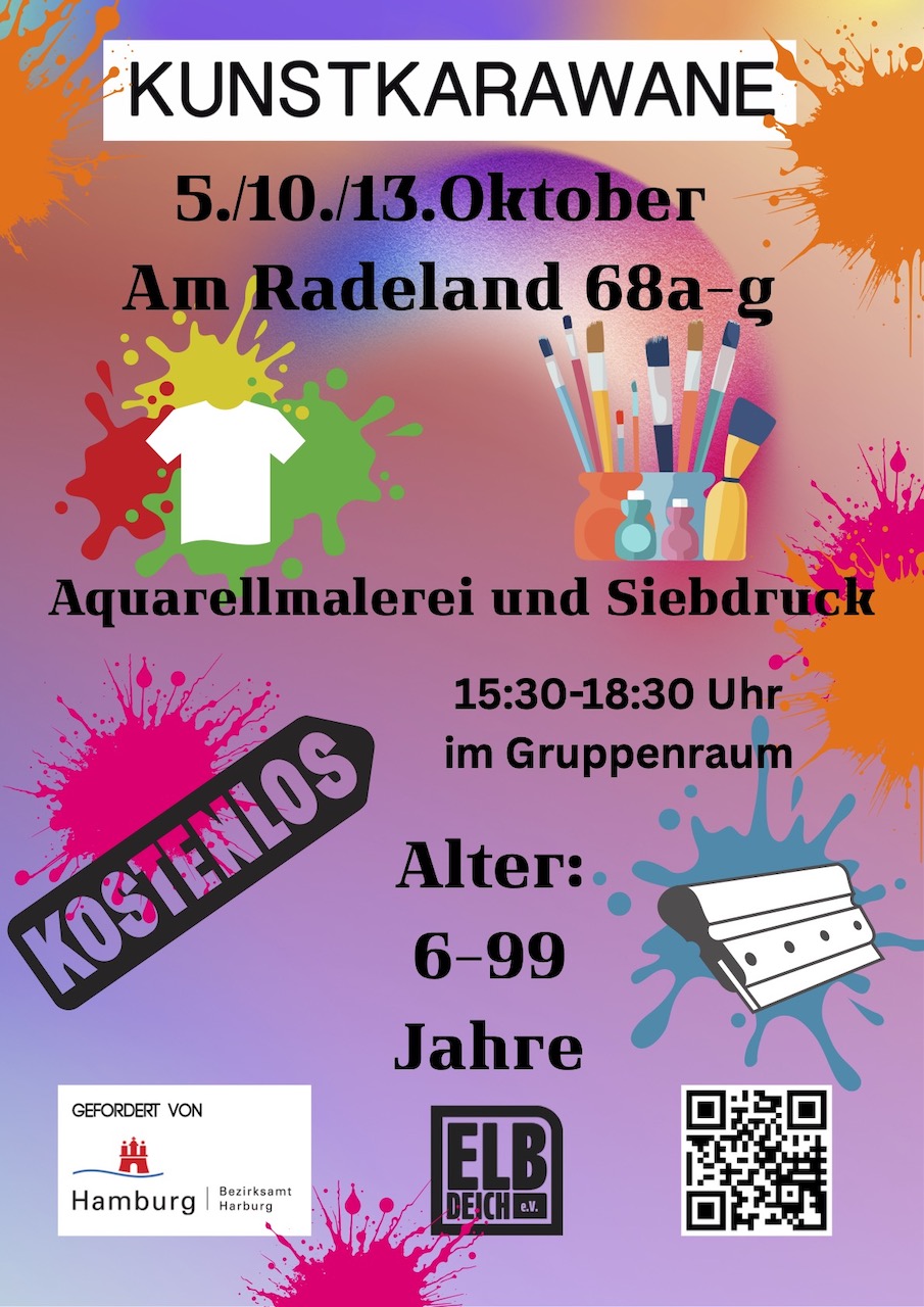 Die Kunstkarawane: Einmal wöchentlich fand schon in der Vergangenheit an unterschiedlichen Orten in Harburg und Süderelbe ein offenes, künstlerisches Angebot statt. Die Durchführungsorte waren unterschiedliche öffentliche Einrichtungen, wie z.B. Kulturzentren oder Jugendzentren und Wohnunterkünfte von geflüchteten Menschen. Jeweils in einem Zeitraum von 3 Wochen, wurden künstlerische Medien vertieft; in den Genres Graffiti, Siebruck, Stencil Art, Platzieren mit Ton, Malerei, kreatives Nähen, Kurzfilme. Es war jeweils auch möglich mit anderen künstlerischen Medien zu arbeiten.