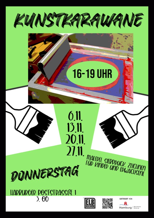 Die Kunstkarawane: Einmal wöchentlich fand schon in der Vergangenheit an unterschiedlichen Orten in Harburg und Süderelbe ein offenes, künstlerisches Angebot statt. Die Durchführungsorte waren unterschiedliche öffentliche Einrichtungen, wie z.B. Kulturzentren oder Jugendzentren und Wohnunterkünfte von geflüchteten Menschen. Jeweils in einem Zeitraum von 3 Wochen, wurden künstlerische Medien vertieft; in den Genres Graffiti, Siebruck, Stencil Art, Platzieren mit Ton, Malerei, kreatives Nähen, Kurzfilme. Es war jeweils auch möglich mit anderen künstlerischen Medien zu arbeiten.